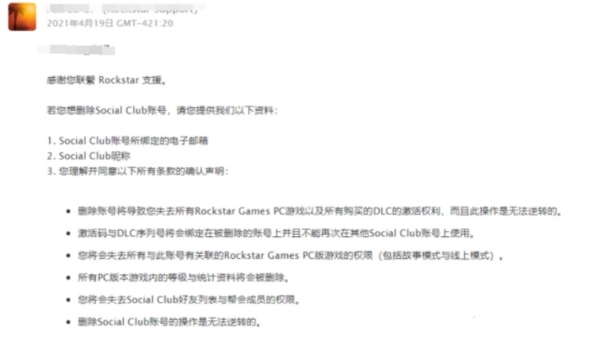 提交后R星会给你所要删除的账户发送